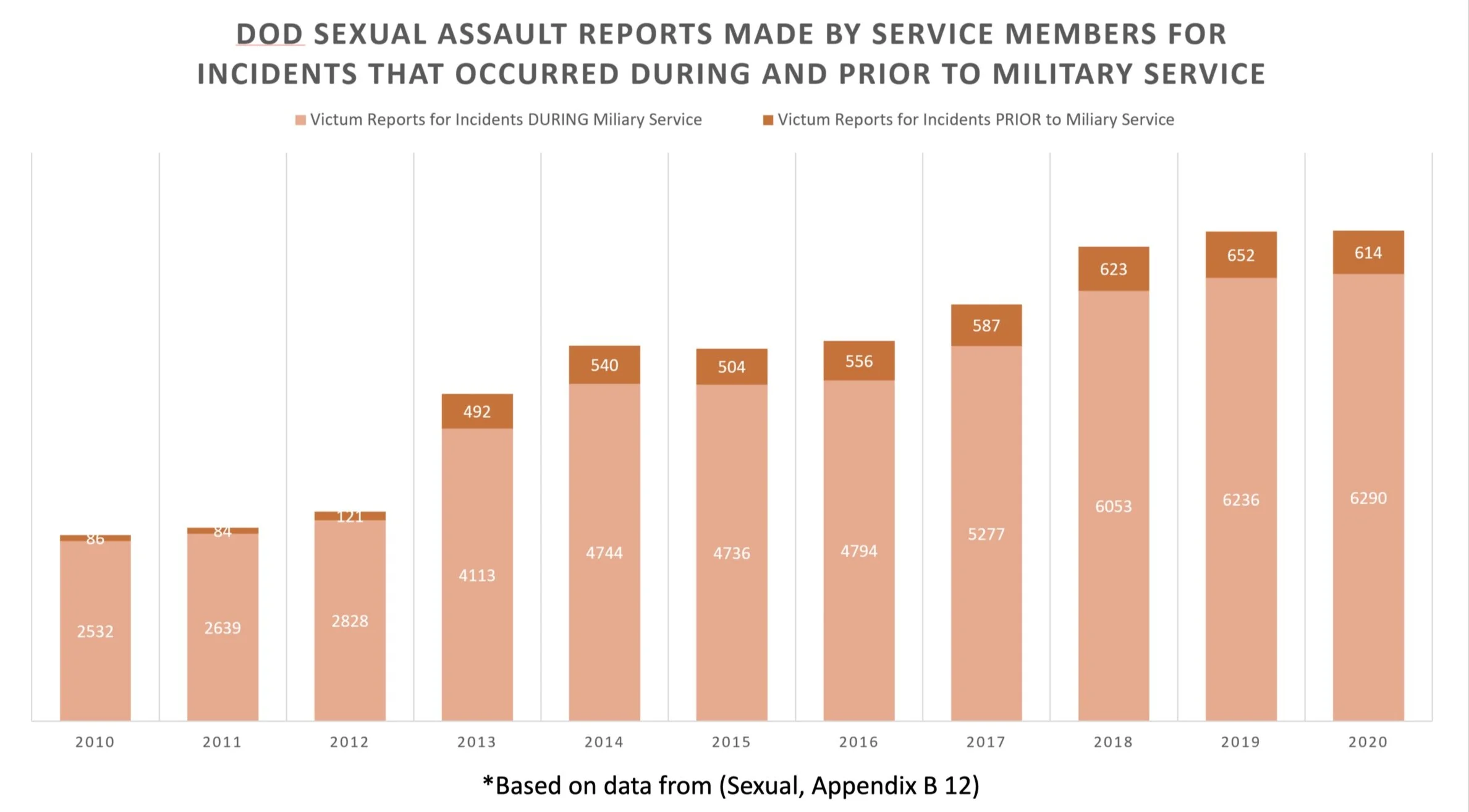 Help is available through an eclectic range of options. When seeking help, victims are first referred to SAPR (Sexual Assault Prevention and Response Office, known as SHARP in the Army), if they have not chosen to privately discuss matters with a therapist first. Again, therapy itself holds a lot of negative connotations in the armed forces. Other victim assistance and advocacy resources include but aren’t limited to, continually credentialing and evaluating SAPR employees. Upholding the SAFE helpline, a 24/7 anonymous hotline for victims. Hosting training engagements for the SAFE helpline. Offering remote SAPR training options for victims that would be uncomfortable attending an in-person seminar. Continuously addressing SAPR stakeholder concerns by responding to specific requests. And allocating $35 million dollars to legal counsel for victims (Sexual, Appendix A 3-5). There is no doubt that the DoD has given MST victims plenty in the way of resources. But taking up less space in the DoD’s fiscal report is what is being done in the way of prevention. While I am pleased that so many resources are available for victims, I cannot help but think. Would all of them be necessary if the DoD weren’t failing to prevent MST from occurring in the first place? In the Below graph, it can be seen that MST reporting has increased 59.7% in the last ten years. It is apparent that something needs to change (Sexual, Appendix B 8).
